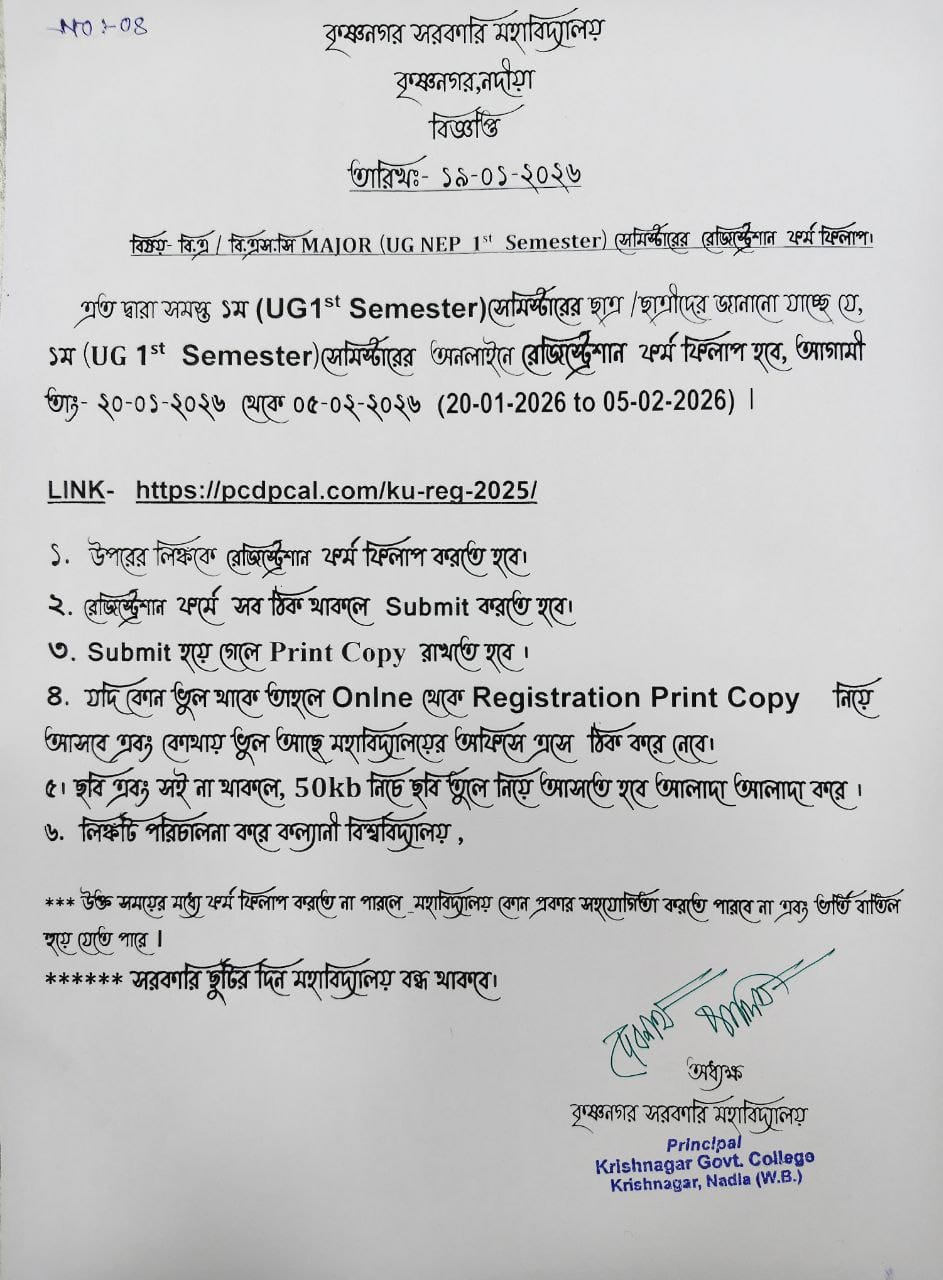 The NCC unit at Krishnagar Government College was established in 2023 with a mission to cultivate qualities such as character development, discipline, secularism, and a spirit of service among youth. Activities include military training, adventure pursuits like trekking and rock climbing, community service initiatives such as blood donation drives, cultural activities, and sports.